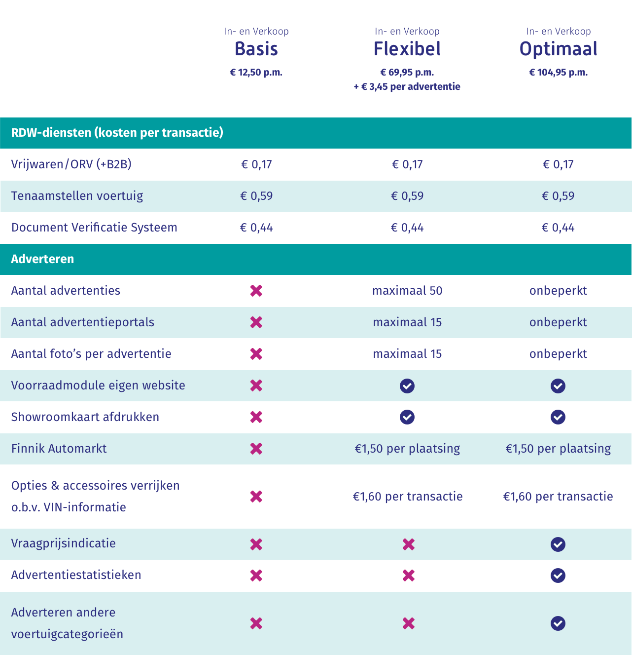 Geen limiet, onbeperkte groei voor de actieve adverteerder. Een ongelimiteerd aantal auto’s, advertentieportals en foto’s. Met In- en Verkoop Optimaal maak je gebruik van de adverteermodule zijn volle kracht. Krijg toegang tot premium opties zoals vraagprijsindicatie, advertentiestatistieken en het adverteren van andere voertuigcategorieën. Met In- en Verkoop Optimaal heb je alles in huis om jouw verkoop te laten groeien. Een premium adverteerpakket, een vast bedrag zonder kosten per advertentie, inclusief de voordelen van In- en Verkoop Basis.