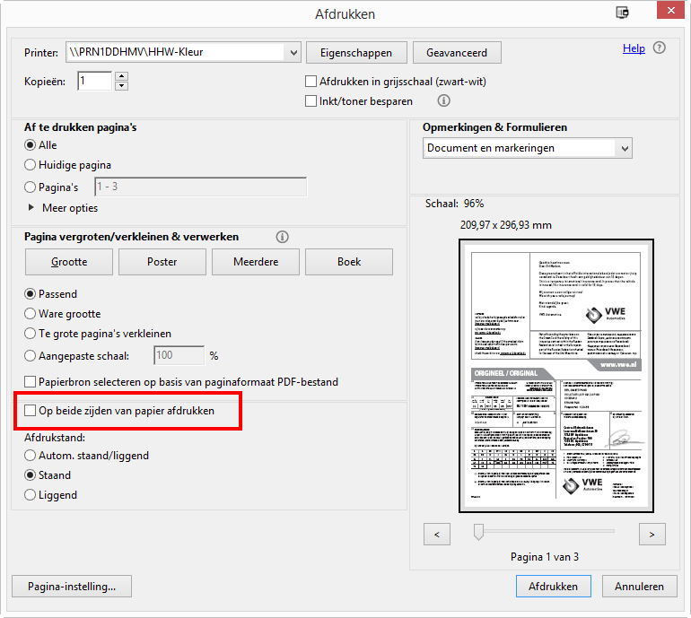 - Zet op het afdrukscherm de optie ‘op beide zijden van papier afdrukken’ uit: